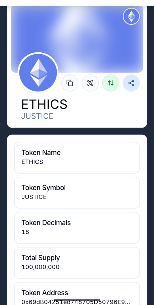Our token follows the ERC-20 standard, which is a widely used protocol for creating fungible tokens on the Ethereum blockchain. This standard ensures that ETHICS (JUSTICE) is interoperable with other ERC-20 tokens and dApps. Using the ERC-20 standard allows us to take advantage of the Ethereum community, including integration with wallets, exchanges, and other blockchain services.